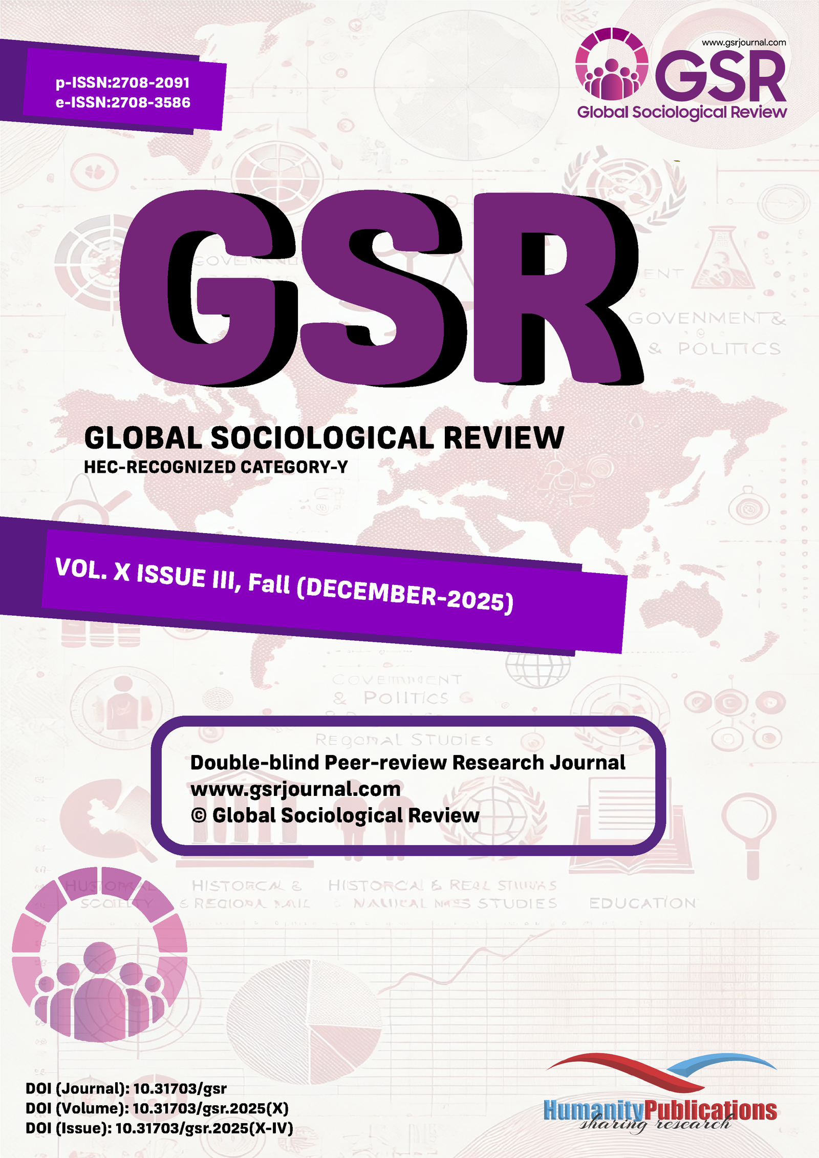 Global Sociological Review (GSR) is published by Humanity Publications, a leading publishing house in Pakistan in research and analytics, that assists researchers in advancing research outcomes for societal benefit. To wipe out societal ills and to add the humanity by boosting up measures among the individuals of the global society. GSR intends to promote qualitative and quantitative researches and findings with the help of newly emerging tools and patterns utilized in experiments, observations, interviews, analysis and surveys by encircling all major segments of Sociology and Inter-disciplinary academic and research disciplines. GSR is a inter-disciplinary, quarterly, double-blind peer-reviewed research journal which encompasses major disciplines of Sociology in general with specific interest in the sub-disciplines detailed at www.gsrjournal.com