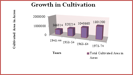 Keeping in view the conditions of desert, specific cropping scheme could not be approved for the entire region. The cropping methods could be adopted after careful study of water resources, soil characteristics, distance from the market etc. The Thal desert is best for orchards, watermelons and vegetables whereas cotton during summer and gram and wheat during winter grew well. Sugar cane improved varieties cultivated in autumn also gave hopeful production. TDA planted forest and shelterbelts to control erosion and thunderstorms (A Handbook of Thal Development Authority, 1954). The cultivated area of Thal was increased from 56681 acres in 1934 to 1301200 acres in 1974, which is three times increased. The expansion of the canal irrigation system and settlement of refugees is the reason for the increase in the cultivated area. The following chart shows an increase in the cultivated area after agricultural development carried out by TDA: